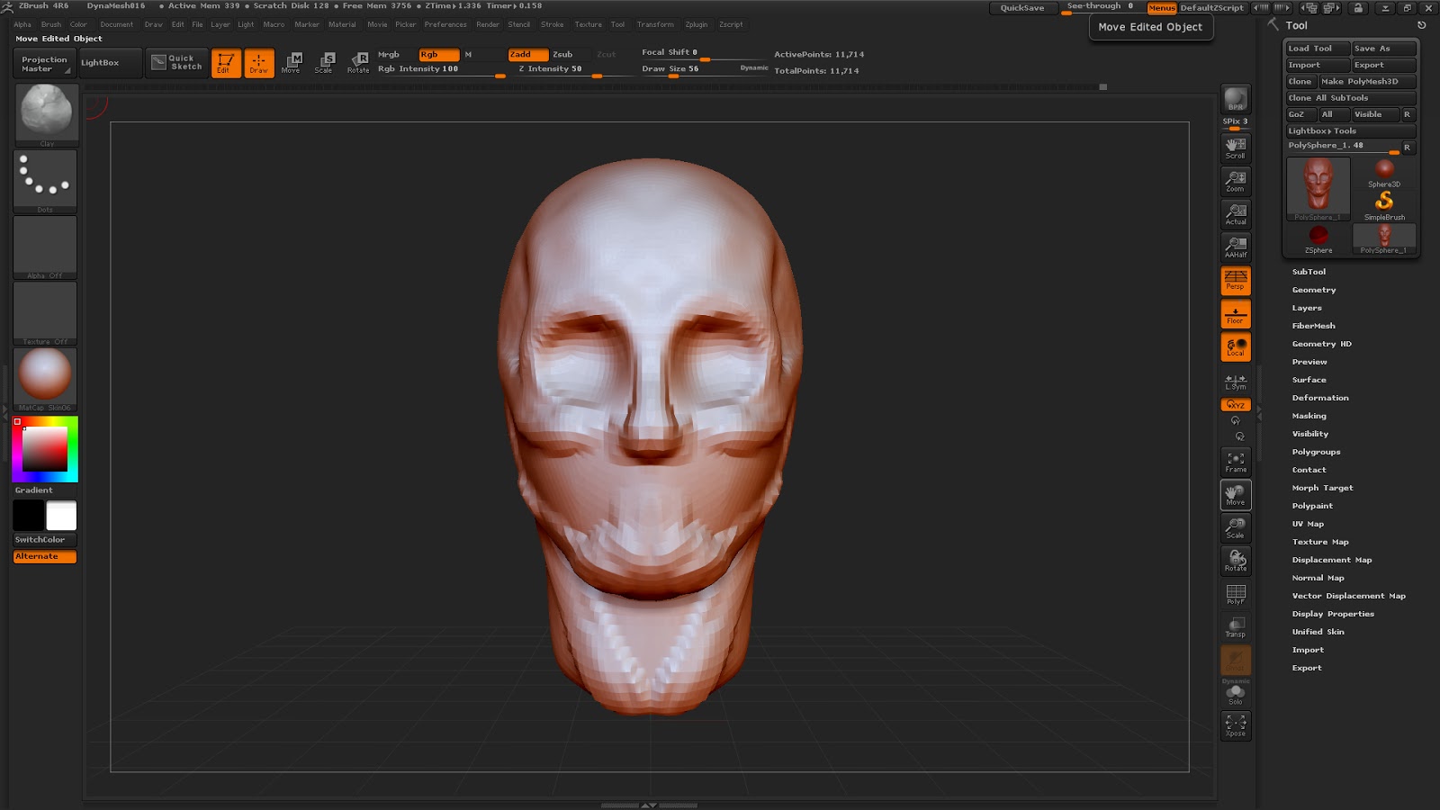 jaw, cheek bones, nose, and eye sockets with the clay brush. At this stage it